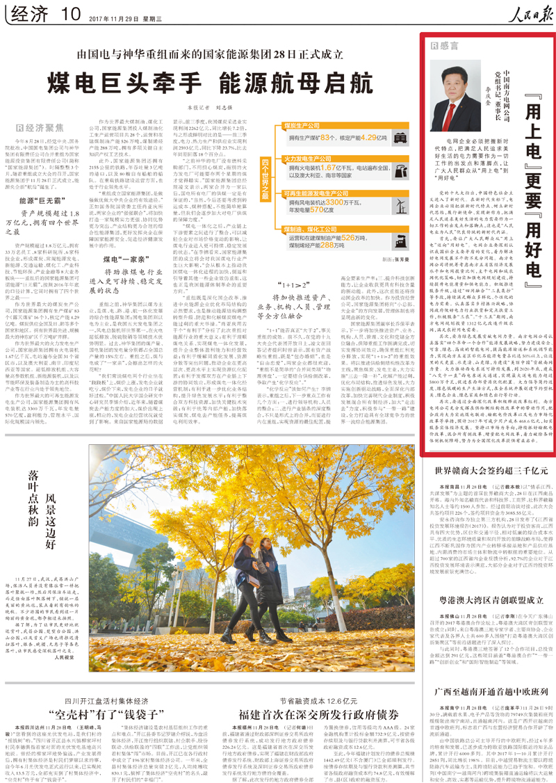 11月29日,人民日报10版“感言”栏目刊发南方电网公司党组书记、董事长李庆奎署名文章:《“用上电”更要“用好电”》。