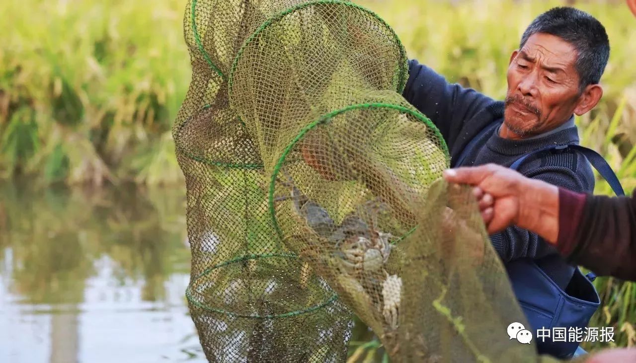 在协鑫新能源江苏阜宁东沟农光项目稻鱼蟹共生试验现场,水稻田的养鱼、养蟹承包户在收获光伏蟹。
