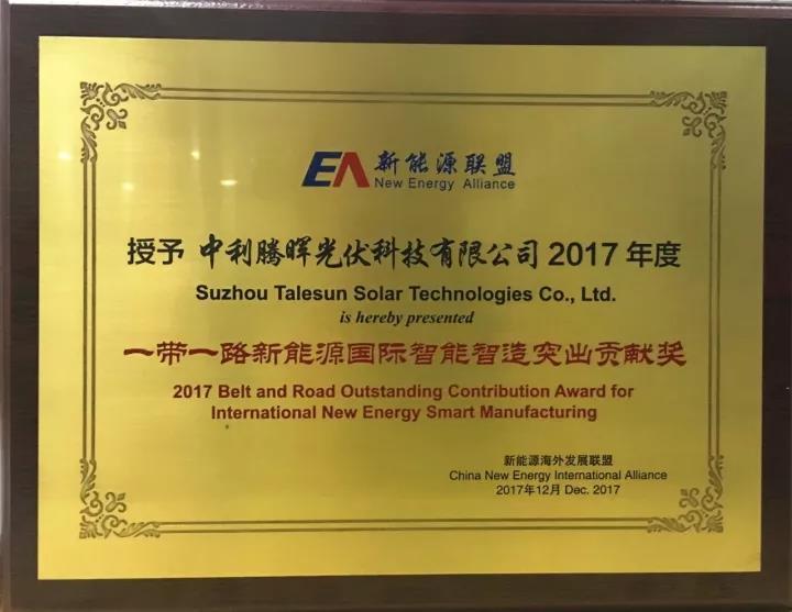 12月5日,以“新时代、新能源、新发展”为主题的2017中国(苏州)新能源国际领跑者大会在苏州召开,本届大会由中国新能源海外发展联盟、上海电力学院联合主办。会议期间,大会组委会发布了“2017 一带一路新能源国际发展突出贡献奖”及系列奖别评选结果,苏州腾晖光伏技术有限公司(以下简称“腾晖光伏”)荣获“2017一带一路新能源国际智能智造突出贡献奖”。