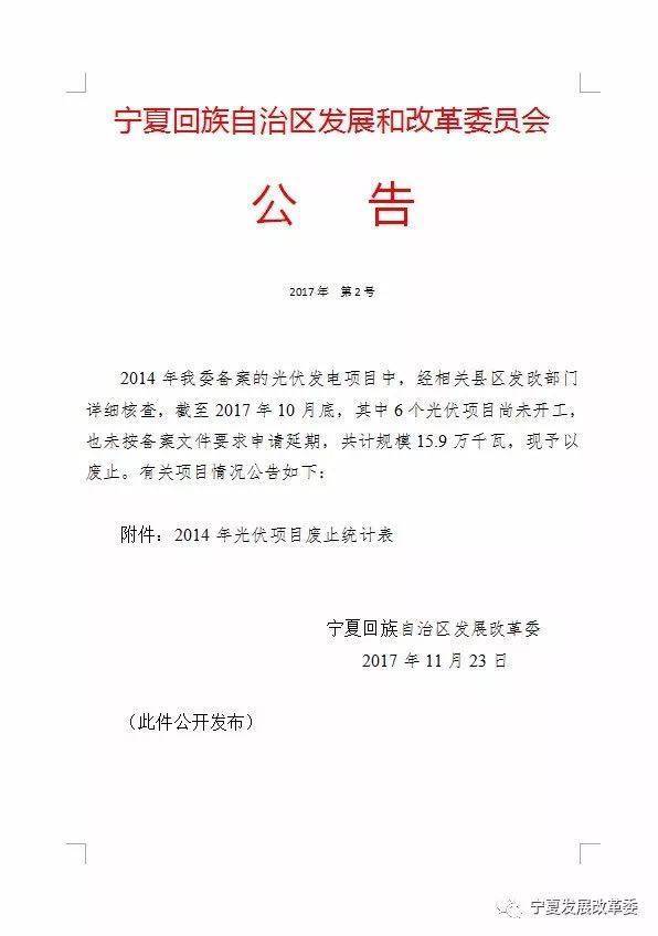 日前,宁夏发改委发布公告废止6个截止10月底尚未开工的光伏项目,总规模共计15.9万千瓦,上述项目都是于2014年备案的项目。