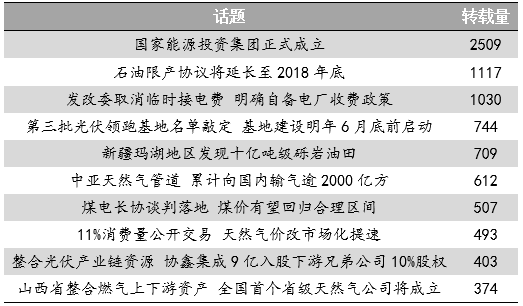 本周,石油输出国组织欧佩克及其伙伴国决定将限产协议延长至2018年底,消息一出立即引发多方解读。此外,中国石油新疆油田公司11月30日宣布,在准噶尔盆地玛湖凹陷中心区发现十亿吨级砾岩油田,这一迄今发现的世界最大砾岩油田引发舆论关注。新能源领域,作为光伏产业目前最受关注的板块,领跑者计划一度被各大光伏企业争抢。11月30日,2017年光伏发电领跑基地名单的公布成为了舆论关注的焦点。本期热点话题详见下表。