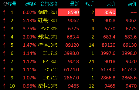 截止午后收盘,锰硅涨6.02%,硅铁涨5.13%,PVC涨3.75%;跌幅方面,焦煤跌3.58%,焦炭跌2.20%,豆一跌1.94%。