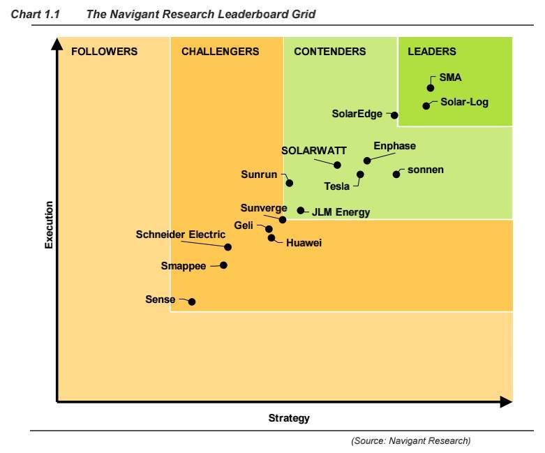 Navigant Research对全球15家领先的户用光伏监控和家庭能源管理系统进行了测评,根据公司愿景、技术、产品功能、合作伙伴、覆盖范围、市场占有率、财务健康状况等几个方面进行打分,给出了一个专业排名,其中,SMA和Solar-Log处于领导者位置。