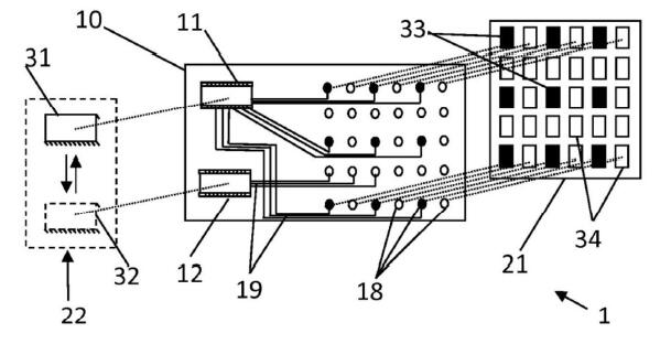 可以使用包括多个多通道集成电路的前端电子子系统并行地读出像素信号。在本领域已知的成像阵列中,IBA MatriXX探测器阵列,来自1024个电离室的电流可以由16个专用芯片并联整合,每个专用芯片具有64个输入通道。因此,这种成像系统还可能需要用于将信号从像素路由并切换到前端电子子系统的读出通道的有效装置。该信号路由可以影响由设备产生的图像的动态范围和图像质量,并且由于可用于路由的区域的限制,还可以影响可实现的探测器区域和像素间距。
