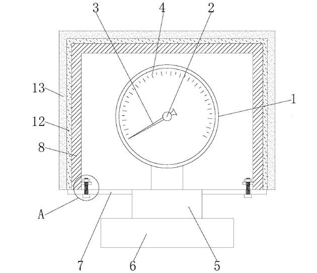 在化工厂的加工车间管道上,需要安装隔膜压力表,以便于测量压力值时使用,目前现有的隔膜压力表,不具有防强腐的功能,由于化工厂在加工的过程中,会用到具有强腐蚀的液体,容易溅到隔膜压力表上,会对隔膜压力表造成腐蚀,一旦隔膜压力表遭到腐蚀后,会导致测量有误差,可能会造成隔膜压力表损坏,从而降低了隔膜压力表的实用性。