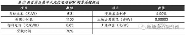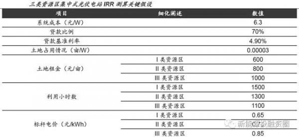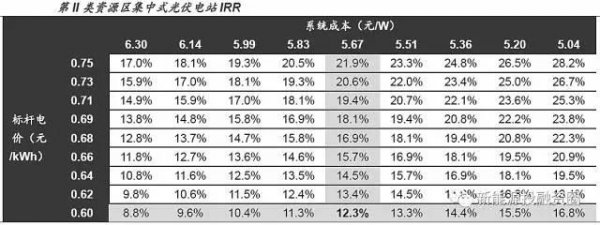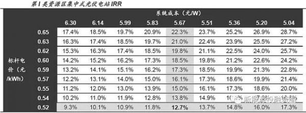 集中式电站具有规模效应,路条资源紧俏,竞争者主要是央企、国企和大型上市公司等,这些竞争者具有强大融资能力。与分布式电站相比,集中式电站的规模效应明显,对公司增长帮助很大,因此集中式电站的路条十分紧俏。而且集中式电站开发和建设难度也相对较高,对资金实力的要求比较大,因此目前主要是央企、国企和大型上市公司参与路条的竞争。这些公司实力雄厚、企业形象好,融资能力很强,可以从银行获得与基准利率相当的贷款。下面将从标杆电价和系统成本两个维度考虑三类资源区的光伏项目IRR如何变化?