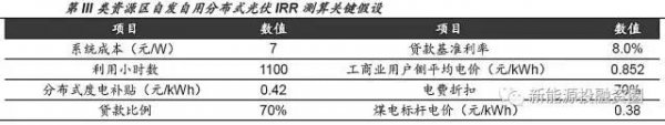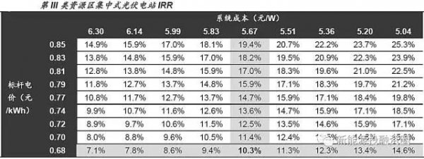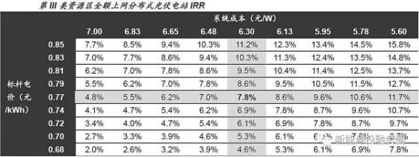 第III类资源区集中式光伏电站在补贴下降20%的时候具有7.1%的收益率。对于第III类资源区的集中式光伏电站,当标杆电价从目前的0.85元/kWh下降20%到0.68元/kWh,如果系统成本不变,IRR还有7.1%,如果系统成本在这个过程中降低10%到5.67元/W,IRR能够达到10.3%。