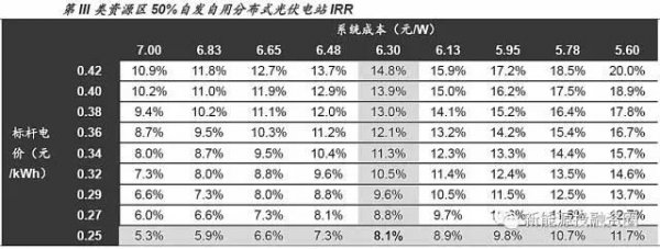 第III类资源区50%自发自用分布式电站在系统成本下降10%的时候可以抵御40%的标杆电价退坡。50%自发自用分布式是指分布式光伏所发的电量有50%为自己使用,剩余50%电量上网,而且自发自用分布式是对全电量进行补贴。对于第III类资源区中50%自发自用分布式光伏电站,当补贴从目前的0.42元/kWh下降40%到0.25元/kWh,如果系统成本不变,IRR只有5.3%,如果系统成本在这个过程中降低10%到6.3元/W,IRR能够达到8.1%。