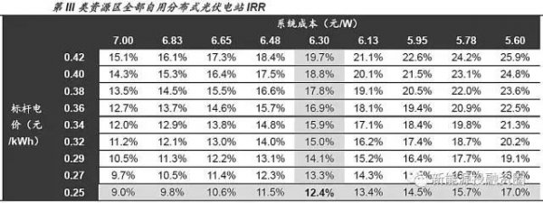 第III类资源区全部自用分布式电站在系统成本下降10%的时候可以抵御40%的标杆电价退坡。全部自用分布式(或称100%自发自用)是指分布式光伏所发的电量全部自己使用,没有多余的电量上网。对于第III类资源区中全部自用分布式光伏电站,当补贴从目前的0.42元/kWh下降40%到0.25元/kWh,如果系统成本不变,IRR也有9.0%,如果系统成本在这个过程中降低10%到6.3元/W,IRR能够达到12.4%。