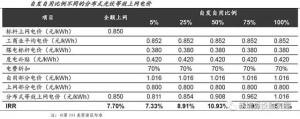 在电价相对较高的工商业用户侧,自发自用比例越高,分布式光伏收益率越高。对自发自用分布式来说,由于自用电量为用户侧电价,而一般用户侧电价要高于当地燃煤标杆电价,特别是工商业的用户侧电价,因此自用比例越高,自发自用分布式的等效电价也会越高。对于第III类资源区的自发自用分布式光伏,当自发自用比例由5%提高到100%时,等效电价由0.811元/kWh提高到1.016元/kWh,IRR由7.33%提高到15.11%。其中,当自发自用比例较低时,自发自用分布式的收益率还会低于全额上网分布式的收益率,这是用电负荷较小群体选择全额上网的原因之一。