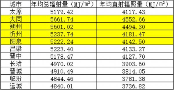 ①光照条件好。山西省北部的大同、朔州、忻州、阳泉位于二类资源区,光照充足,其余属于三类资源区的城市,光照条件在三类地区中也处于较高水平。
