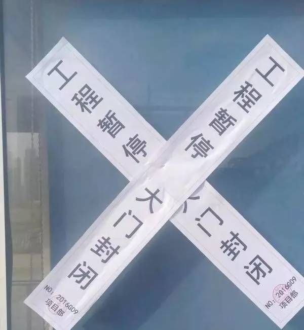 项目目前正在施工的是A地块,虽然有几栋楼形似封顶,但项目整体距离完工还相去甚远。大片土地还处于未动工的状态。在工地的大门上,两张封条赫然写着:“工程暂停,大门封闭”的字样。红色的公章上的落款是“NO.2016G09项目部”。