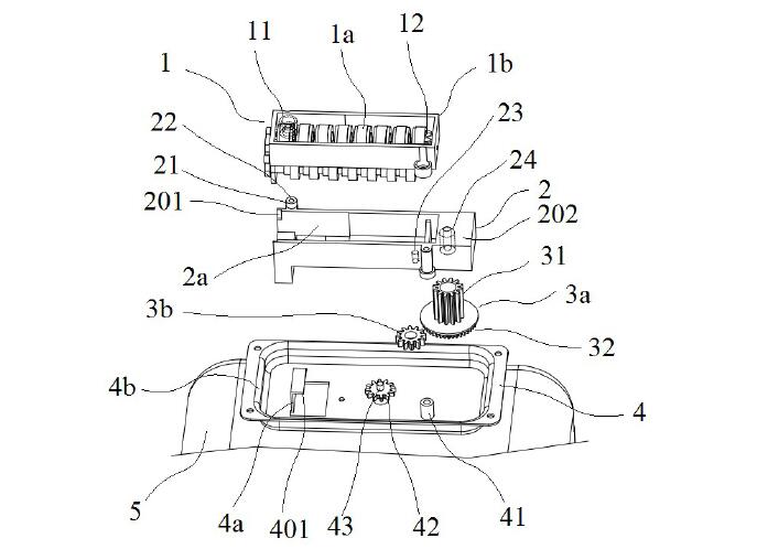 所述传动齿轮组还包括与第一传动齿轮啮合传动的第二传动齿轮,第一传动齿轮与输出齿轮啮合传动,转接支架设有定位第一传动齿轮的第一固定轴以及定位第二传动齿轮的第二固定轴。转接支架对第一传动齿轮和第二传动齿轮进行轴向定位,传动齿轮组与基表支架内的输出齿轮保持稳定的啮合传动。第二传动齿轮包括同轴布置的下齿盘和上齿柱,下齿盘与第一传动齿轮啮合传动。转接支架的一侧设有下安装孔,安装部为竖直设置在基表支架底面上的支撑柱,支撑柱顶部设有与下安装孔位置对应的定位孔,下安装孔的底部设有与支撑柱顶部相配合的凹槽。转接支架下安装孔底部的凹槽与基表支架支撑柱顶部对应,安装时支撑柱顶部进入到凹槽内,在对转接支架进行定位的同时,将定位孔和下安装孔对齐,便于使用螺丝拧紧固定。