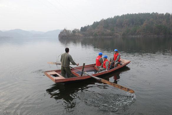 图为:12月8日,湖北电力员工借用船只渡河到达丹江口土关垭镇岱湾白庙沟移动基站,更换安装该镇最后一块智能电表。
