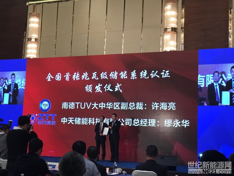 2017年12月16日,TÜV 南德大中华区副总裁许海亮为中天科技颁发了国内首张TUV南德电力储能系统安全认证证书。这标志着中天超高效、友好型集装箱式储能系统的研制与产业化已经具备了在国际市场上批量推广的能力,这一成果对中国储能行业走上规范发展道路具有历史性里程碑意义! 近年来全球储能市场稳步前行,有数据显示,近五年全球储能行业的年复合增长率达到193%,预计未来十年我国储能市场的容量将达到1000亿美元