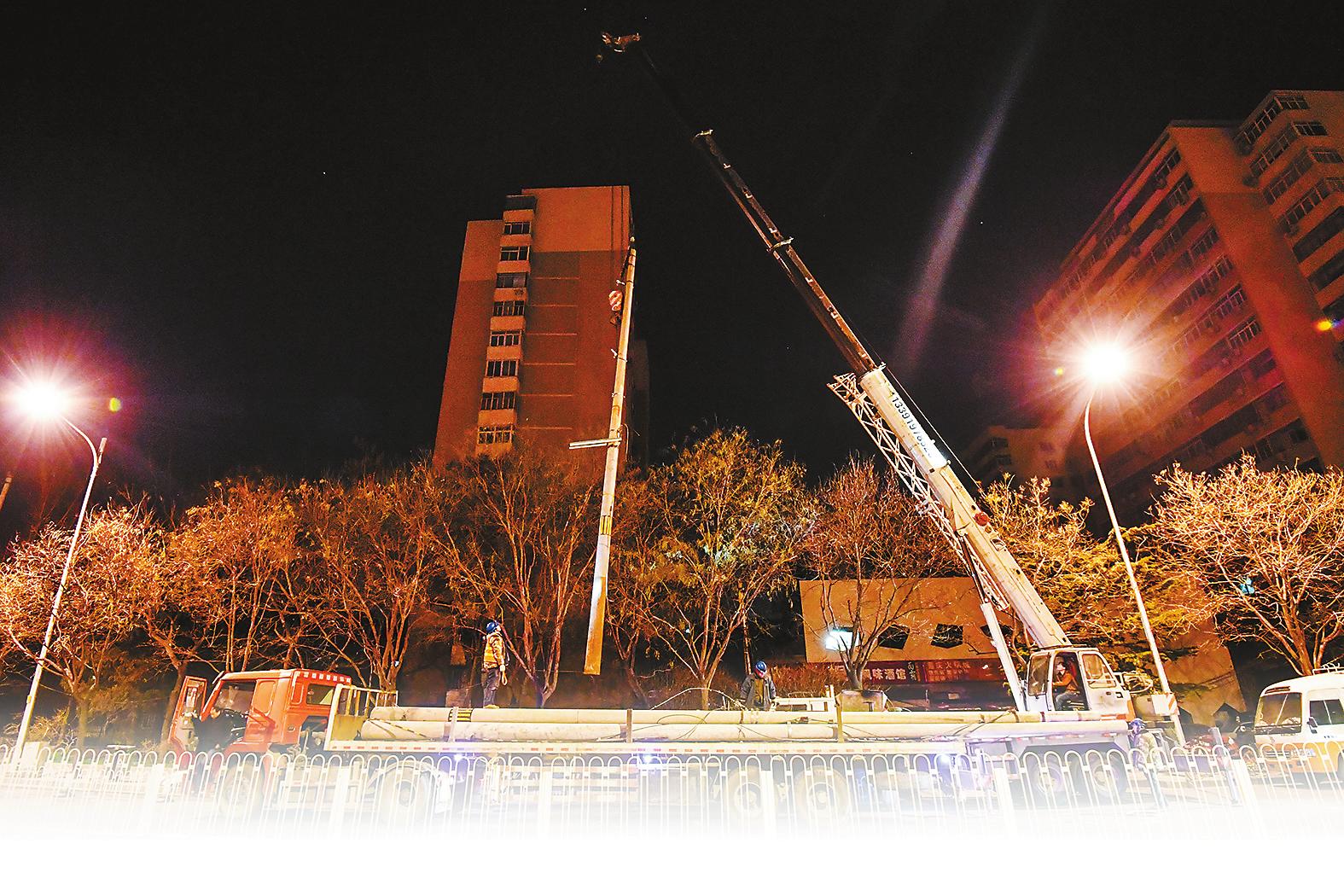 12月13日凌晨2时,北京市西城区白云路上,伴随着吊车的轰鸣声,国网北京电力的工作人员在零下11摄氏度的环境中进行电线杆拆除作业。 范超 摄