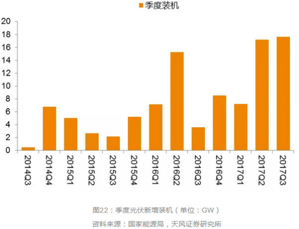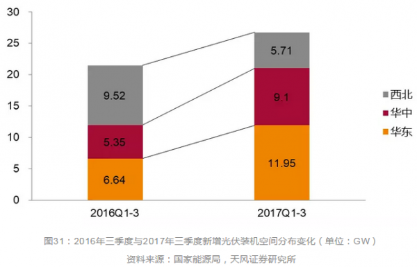 截止到今年三季度末,新增光伏装机数据可以看出来,结合消纳、优化布局的调整已经发力,新增光伏装机增速最快的是华东地区,2017年前三季度增速80%,华中地区增速70%,而西北地区新增装机出现下降。