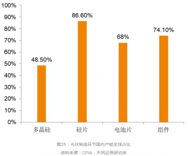目前光伏制造已经全产业链实现国产化,并且引领全球的新技术与总产能,硅片、电池、组件国内产能已经占据全球产能一大半。多晶硅、硅片、电池片、组件产能分别占全球产能48.5%、86.5%、68%、74.1%,只有多晶硅料环节产能不足全球产能一半。