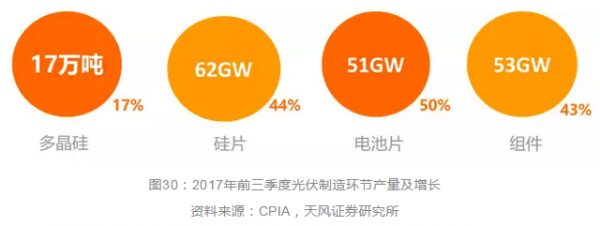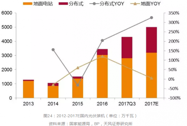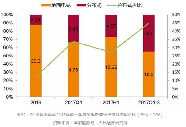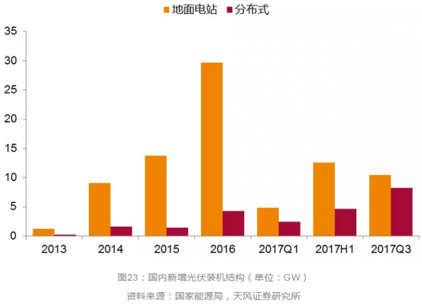 2017年前三季度分布式新增装机15.3GW,超过去年全年分布式光伏新增装机的3倍;地面电站新增装机27.3GW,增速开始放缓。