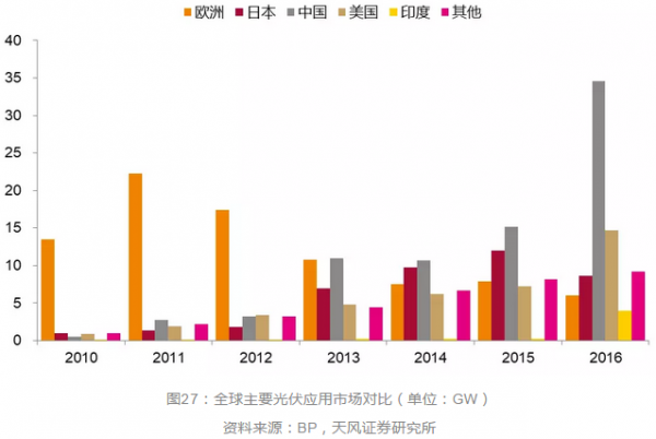 光伏发电投资热情高涨不是国内独有,美国、印度、以及光伏新兴市场,下游装机也同样需求火爆。通过对比2010年-2016年全球主要光伏应用市场新增装机变化,可以看出欧洲、日本成熟市场装机量已经趋于平稳甚至下滑;中国、美国、印度依然呈高速增长;其他新兴国家也正在慢慢释放需求。2017年,中国、美国、印度三大快速增长市场预计将达到50GW、18GW、8GW装机量,由于中国市场需求火爆、美国201法案调查推动提前强装,挤压组件向印度市场的供应,可能导致印度市场低于10GW的装机计划。