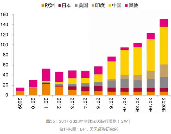 光伏系统装机成本目前每年超过10%的速度下降,越来越多的国家开始投资或准备投资开发光伏发电产业;在成熟市场,越来越多的应用模式开始有经济性。我们认为到2020年,国内依然是全球光伏应用的主要市场,分布式、光伏扶贫、领跑者三驾马车拉动国内需求启动第二波快速增长。欧洲、日本市场趋于稳定,美国市场由于今年透支了部分2018年的指标,将2018年或新增装机有所下降,但中长期来看,美国新增市场容量非常可观。