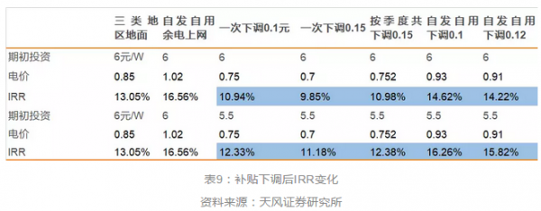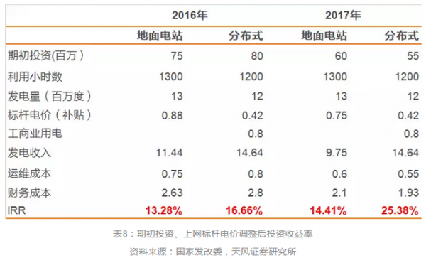 分布式补贴没有变化,期初投资成本大幅下降前提下,分布式项目投资收益率大增;地面电站期初投资下降、标杆电价下调后,也依然能保证电站投资收益率上升。