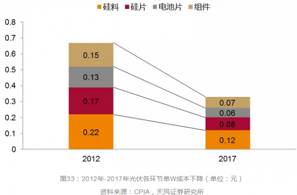 IRR是驱动电站投资热情的关键。虽然“630”之后地面电站上网标杆电价下调,度电收益率下降。但是电站期初单位投资,2016年-2017年大幅下降,其中组件价格,2016年上半年3.8元/W,目前已经下降到2.7元/W的水平,下降幅度28.95%。随着组件转换率提升,单瓦BOS成本下降,系统投资成本由2016年7元/W以上,下降到5元/W-6元/W的水平。