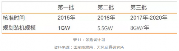 2015年核准的第一批领跑者项目——大同采煤沉陷区,已于五月下旬全面验收;第二批5.5GW部分已经于三季度末并网,剩余部分预计将于年底并网。2017年能源局下发2017年-2020年四年的光伏指标,计划每年建设8GW光伏领跑者基地项目。