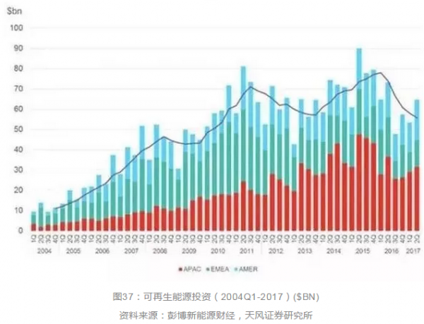 光伏行业已悄然发生变化,不再是昔日一个市场变动,全球行业伤筋动骨的年代,光伏行业2011年在欧洲达到顶峰,2017年也许在中国也达到顶峰,但是全球来看,行业投资近几年一直是向上的,因为新兴市场正在崛起。彭博新能源财经最新发布的二季度清洁能源投资数据,投资638亿创2016年二季度以来的新高,环比上升21%。这主要受益于阿联酋两大光伏项目20亿美元的投资;美国和中国投资相比上季度分别上涨51%和32%,墨西哥、澳大利亚和瑞典融资额急剧增加,埃及、阿根廷创历史新高。全球清洁能源迎来复苏。