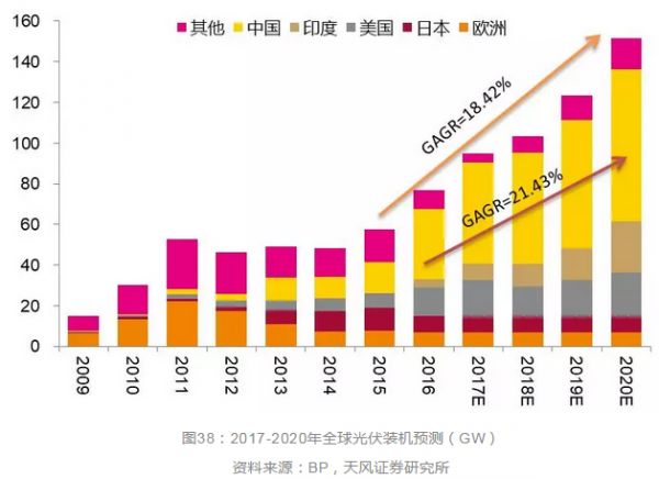 通过国内成熟、高增长及新型市场的剖析,我们认为全球光伏市场正在去中心化,一个市场的的波动或许对光伏产业链造成一些波动,但已经远不能造成寒冬式的冲击。行业成本下降速度超出预期,补贴和指标限额的天花板逐渐提高,越来越多的新兴市场开始投资光伏,行业正在逐渐摆脱补贴,依靠市场驱动力增长。预计到2020年,中国、美国、印度以及全球新增装机将达到75GW、22GW、25GW、151GW;国内复合增长率达到21.43%,全球复合增长率达到18.42%。