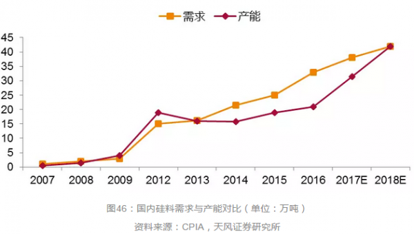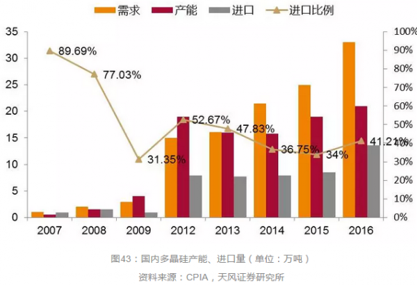 2016年底国内硅料产能21万吨,预计2017年底产能将达到31万吨,2018年底将超过40万吨,国内勉强可以实现自给自足,但由于部分不足万吨产能的小厂将面临淘汰,预计2019年前后,多晶硅依然需要进口。