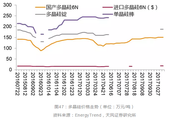 按照目前硅料价格水平以及国内核心硅料厂商的成本分布,多晶硅环节毛利率水平非常高,部分企业目前已经超过50%。按照目前装机需求,以及多晶硅产能释放进度,到2018年底,多晶硅环节毛利率水平依然维持高位。