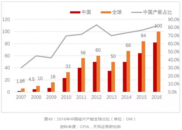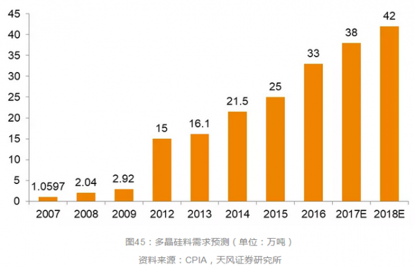 且按照近两年产能扩张比较大的厂商规划,2017年隆基股份、中环股份扩张产能超过15GW,国内硅片产能占比还有继续提升的趋势。所以,国内多晶硅料对硅料的需求还会继续提升。