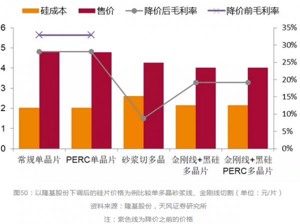 而多晶采用砂浆线切割的硅片,毛利率水平已经完全不能与单晶相提并论;经过金刚线改造后的多晶硅片,由于存在表面光反射问题,需要叠加黑硅技术,增加光转换率。