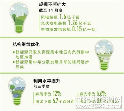 利用水平提升。弃风弃光一直是新能源发展的“老大难”。今年前三季度,弃风、弃光率分别为12%和5.6%,同比分别下降了6.7个百分点和3.8个百分点,新疆、甘肃等重点地区弃风率分别下降了12.1个百分点和10.5个百分点。国务院发展研究中心资源与环境政策研究所研究员郭焦锋认为,新能源技术也在不断提升,“我国光伏发电效率原来大概在14%—16%,现在能达到16%—18%,好一点的甚至能达到20%左右。”
