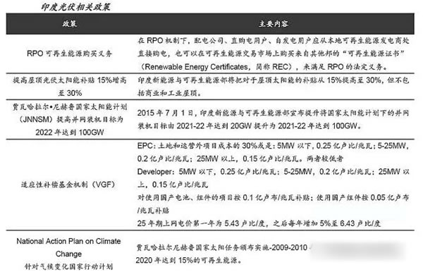 整体而言,印度政府推出了宏大国家太阳能计划——至2022年,总装机容量将达到100GW,该计划被认为是推动印度光伏行业发展的主要动力。印度政府政策包括可再生能源购买义务(RPO)、各类融资激励、穆迪政府推出的UDAY计划、太阳能公园等。RPO方面,在光伏发展初期,印度电力部积极实行针对太阳能的可再生能源购买义务目标(RPO),从2011年初的0.25%提升到2022年最高3%。而在16年,印度电力部提高了RPO要求,2022年为8%,进一步刺激了太阳能光伏的发展。各类融资激励包括:适应性补偿基金(VGF)、加速折旧、十年期公司税等,此外,印度国家开发银行对太阳能项目融资也提供一定程度便利。UDAY计划,该计划旨在为电力分销公司承担部分债务,改善其资本结构,降低其经营风险。目前,已有27州和联邦属地加入该计划,已引发约300亿美元债券,占整个太阳能公司负债近50%。太阳能公园,印度政府计划于2020年建成共计40GW的太阳能公园,并提供12亿美元的资金支持。目前,已建成8.9GW。