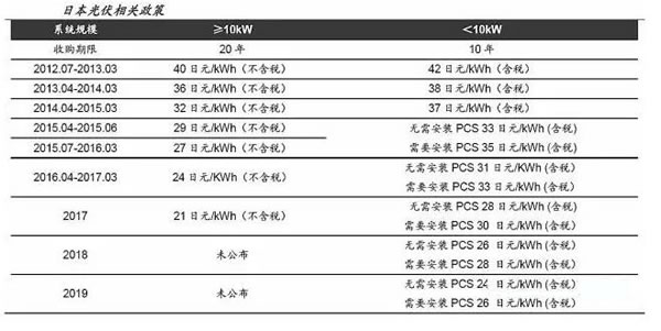 3、日本:全球第二大光伏应用市场,快速增长源于FiT补贴政策,目前补贴也在持续下降