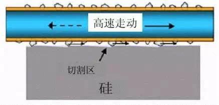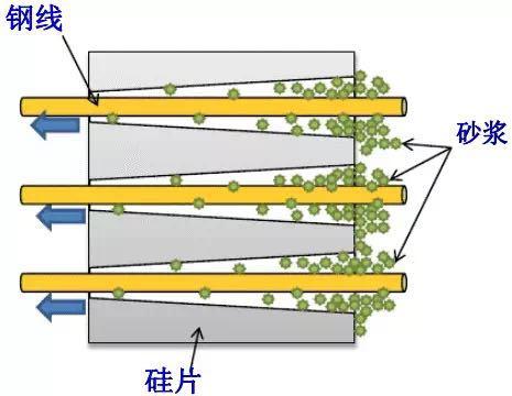 金刚线切割和砂浆切割的基本区别在于,金刚线切割是切削加工,即将金刚石采用粘接和电镀的方式固定在直拉钢线上进行高速往返切削,而砂浆切割是“滚动-嵌入”切割,靠悬浮液的悬浮碳化硅通过线网的带动,进行磨削切割。
