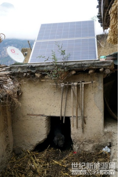 (一户“悬崖村”村民猪圈上装的光伏电站,高山之上开辟的“牧光结合”光伏应用模式。光伏面板前方是有线电视接收器,村民有时用光伏发电来满足生活所需,其中包括看电视等。)