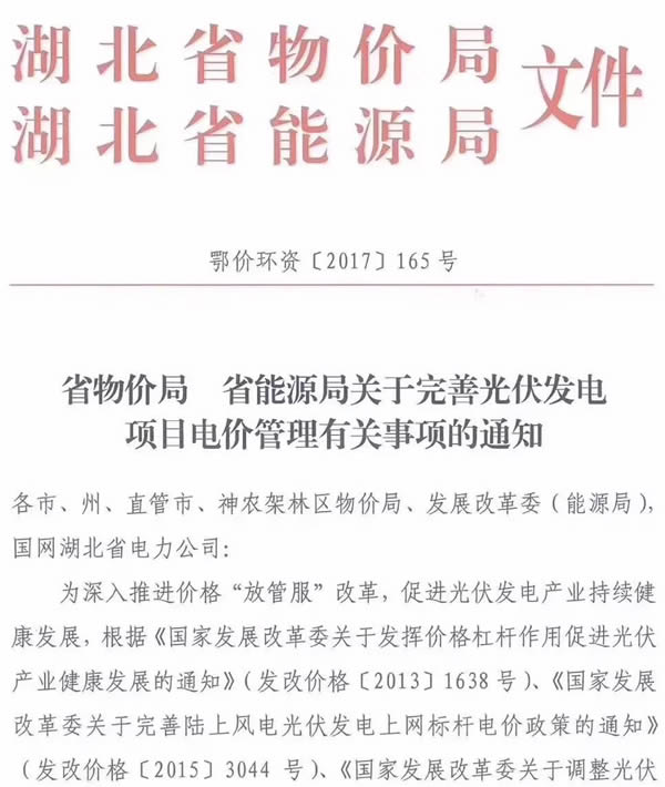 15日,湖北物价局、发改委下达《关于完善光伏发电项目电价管理有关事项的通知》。