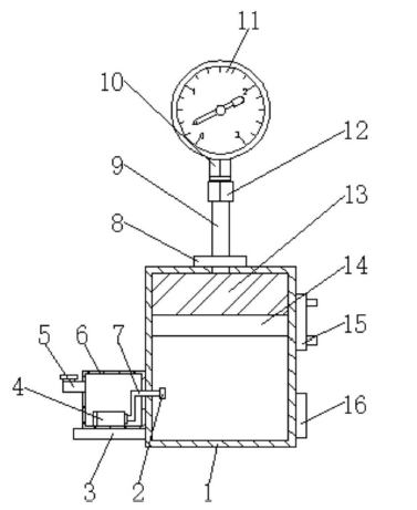 水箱的底部固定连接有承载台,承载台的右侧与保护箱的左侧固定连接。优选的,入水口的顶部活动连接有盖板,且盖板底部的横截面积大于入水口顶部的横截面积。优选的,保护箱顶部与连接管底部的连接处通过密封圈固定连接。优选的,压力表本体的正表面设置有刻度纹,压力表本体正表面的中心处活动连接有指针。
