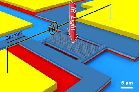 设备的结构示意图。蓝色有孔的平面是位于上面的膜层,里面有光子晶体空腔,可捕获特定频率的光。当这种情况发生时,会产生一个可以被测量的电流(A)。援引:荷兰埃因霍温理工大学