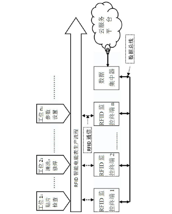 RFID智能电能表在生产初始阶段(电路板贴片)最先焊接RFID芯片,这样电能表电路板具有了可实现数据通信和存储能力,将RFID监控终端固定在生产流程关键的工位上,通过手持机或者数据总线对RFID监控终端的工位信息进行设定,包括生产线编号、设备信息、工装工具信息、制造执行信息、工位内容,人员编号等等,当流水线将含电路板的电能表(未成形)通过RFID监控终端工位时,RFID监控终端会将对应的工位信息等内容写入到RFID芯片的存储器中,同时将仪表RFID芯片的唯一标识码读到RFID监控终端中,并实时将通过该位置的RFID智能电能表的RFID标识码和对应的该工位信息等内容打包通过总线传输数据集中器,由数据集中器上传到云服务平台,电力监管人员据此可以建立电能表生产电子档案,实时调用云服务平台中的制造信息,实现的对电能表生产制造过程的监控和管理。