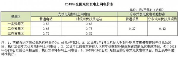 降低2018年1月1日之后投运的光伏电站标杆上网电价,Ⅰ类、Ⅱ类、Ⅲ类资源区标杆上网电价分别调整为每千瓦时0.55元、0.65元、0.75元(含税)。