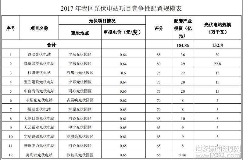 根据国家能源局印发的《关于同意宁夏利用电力外送通道配置光伏电站方案的复函》(国能函新能〔2017〕65号)有关精神,经自治区政府同意,2017年我区光伏电站项目竞争性配置指标为132.8万千瓦。按照《自治区人民政府办公厅关于印发光伏园区电站项目资源配置指导意见和光伏电站项目备案和建设管理办法的通知》(宁政办发〔2016〕4号)和《关于开展2017年我区光伏电站项目竞争性配置的通知》(宁发改能源(发展)函〔2017〕646号)有关要求,此次光伏电站竞争性配置的原则:一是综合考虑企业配套产业对自治区经济社会贡