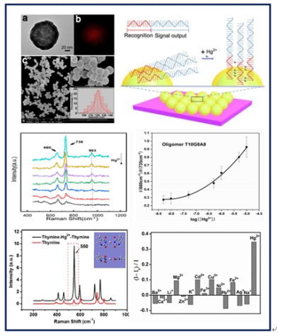 为此,黄青等设计了能够有效的捕捉水样中的汞离子并产生拉曼散射增强效应的纳米粒子——适配体复合检测体系。研究人员在SiO2@Au纳米粒子表面修饰上能有效捕获汞离子的DNA适配体,利用DNA分子中T碱基和Hg(II)形成T-Hg2+-T结构的特性,能够高效捕获Hg2+,并产生SERS信号改变。实验结果表明,在加入Hg(II)后,设计DNA分子中的腺嘌呤(A)产生736cm-1SERS信号与鸟嘌呤(G)产生的位于660cm-1的SERS信号的峰强的比值会随检测Hg(II)浓度增加而减小,并出现一些特征新峰,如550cm-1。计算表明,它来源于汞离子取代了T上的H在两个DNA分子间形成N-Hg-N结构而发生的伸缩振动。利用这些变化,可以对Hg(II)的进行快速、特异性和半定量的痕量检测。