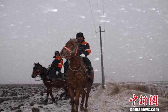 国网昭苏县供电公司骑马巡视输配电线路。 刘显刚 摄 受强冷空气影响,新疆27日遭遇一次恶劣暴雪大风沙尘天气入侵,雨雪天气席卷北疆,大风扬沙覆盖南疆,乌鲁木齐市区积雪厚度达到36厘米