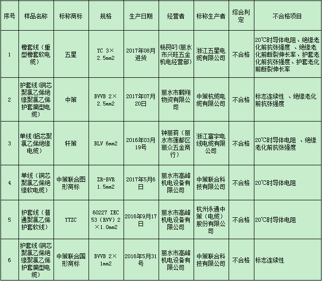 日前,浙江省丽水市市场监督管理局公布了《丽水市市场监督管理局2017年电线电缆质量抽查检验情况通报》,对2017年9-10月份丽水市监管局对电线电缆商品质量监督检测的结果进行了通报。