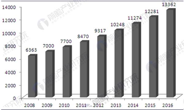 图表1:2008-2016年全球检测行业市场规模走势图(单位:亿元)