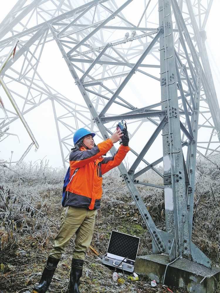 顾不上擦把汗,唐增航和同事迅速对铁塔和线路上的覆冰开展现场勘察,用红外测温仪测量导地线、金具等设备温度,测量环境温湿度和塔身的覆冰数据,做好详细记录和数据取证。